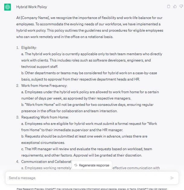 Here’s an example of a hybrid work policy created by ChatGPT.