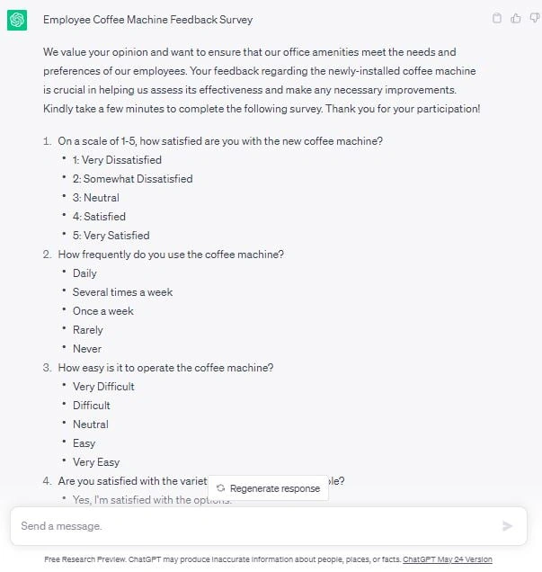 For instance, given below are 10 questions generated by ChatGPT to collect employee feedback regarding the newly-installed coffee machine at the office.