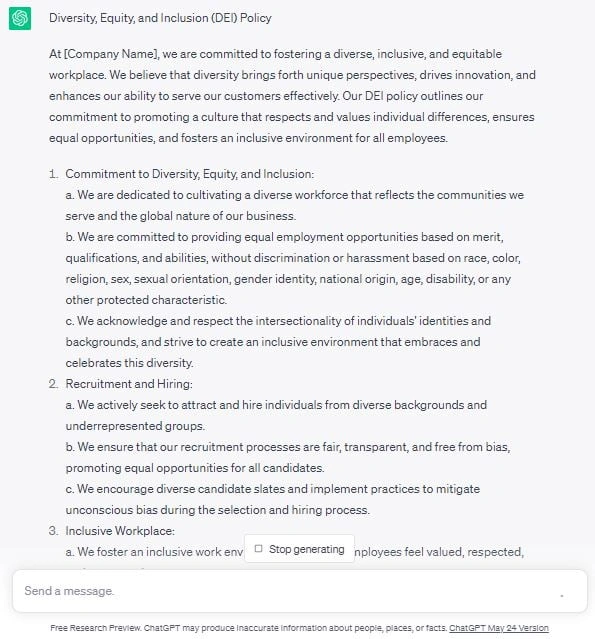 Take a look at the example of the DEI policy created by ChatGPT: